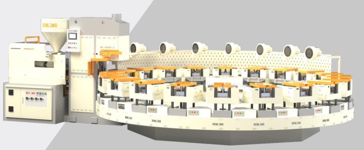 圓盤(pán)式內(nèi)注連幫注射成型機(jī):雙人協(xié)作(1人取楦,1人套幫)就可做鞋,全自動(dòng)開(kāi)合模,高效又省力!
